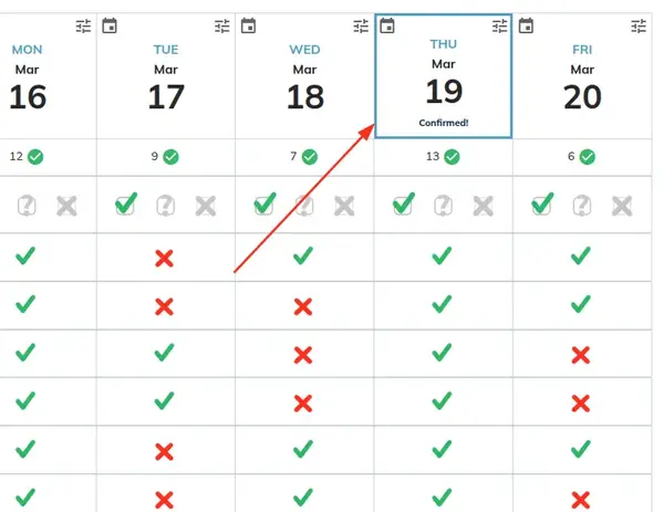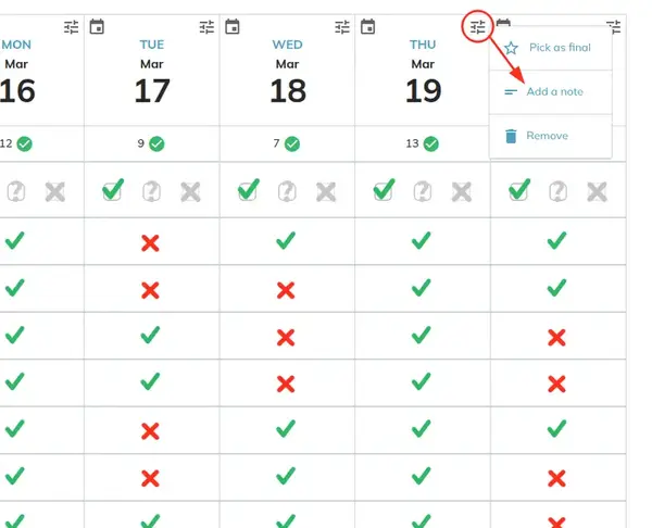 Navigate to your poll results. For any date or time slot you wish to confirm or comment on, click the Options in the corner of that specific time slot.
